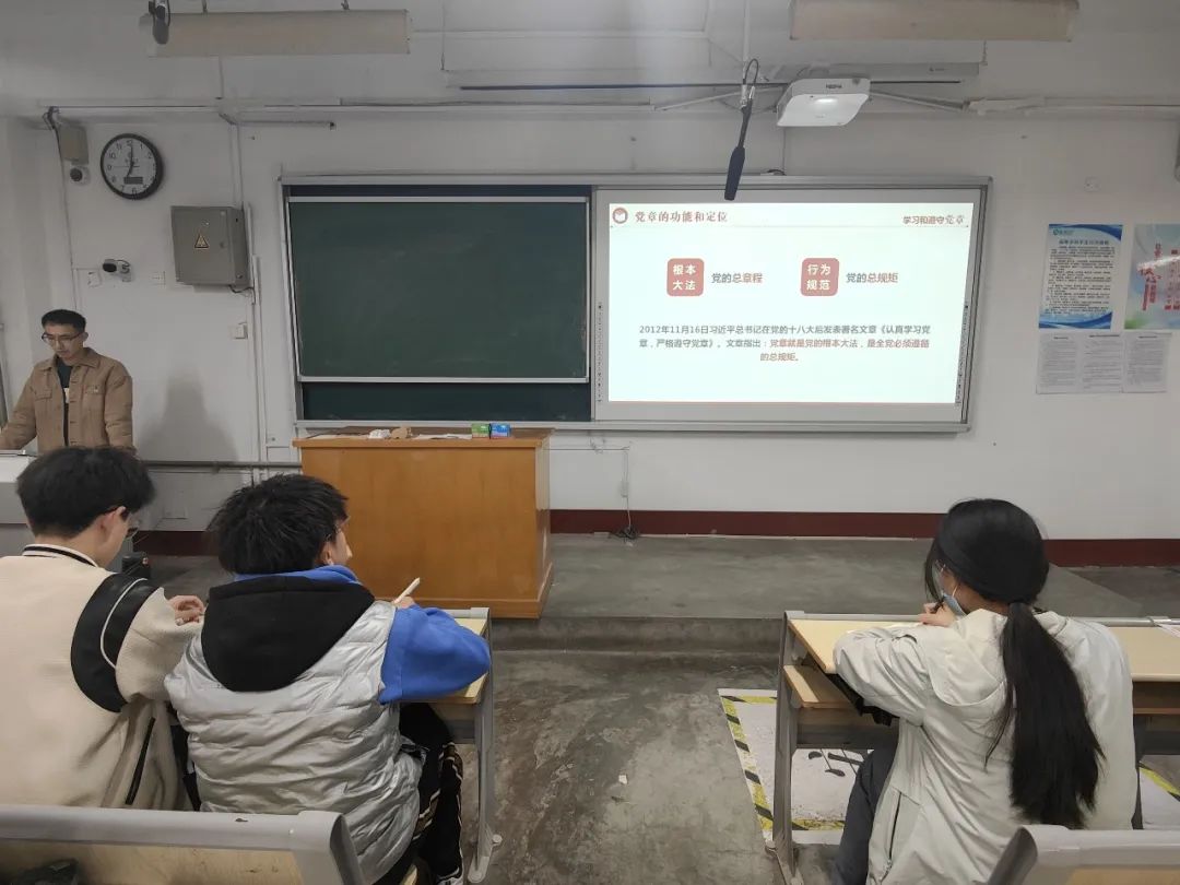 本次会议主要围绕“中国共产党章程”与“四讲四有”两个主题展开。徐志远老师为入党积极分子们讲述了中国共产党章程的概述,他强调认真学习中国共产党章程、严格遵守中国共产党章程,是加强党的建设的一项基础性经常性工作,也是全党同志的应尽义务和庄严责任,对强化全党中国共产党章程意识,增强党的创造力、凝聚力、战斗力具有极为重要的作用,作为入党积极分子必须严格遵守并执行。随后,他向入党积极分子介绍中国共产党章程的发展历程并讲述了党中国共产党第一个纲领、党的二十大对中国共产党章程做的重要修改等重要内容。接着他对四讲四有做出详细阐释,勉励入党积极分子自觉践行社会主义核心价值观、自觉投身工作一线,积极践行四讲四有,争做讲政治、有信念,讲规矩、有纪律,讲道德、有品行,讲奉献、有作为的合格党员。入党积极分子认真听课并做好党课笔记,纷纷表示自己将心怀家国情,永远跟党走,发扬党的优良传统和作风,自信自强、守正创新,在奋发有为中筑牢信仰之魂。最后,入党积极分子收看了以“中共二大会址纪念馆:首部中国共产党章程的诞生与保存”、“中共二大会址纪念馆首部中国共产党章程的诞生与保存”。
