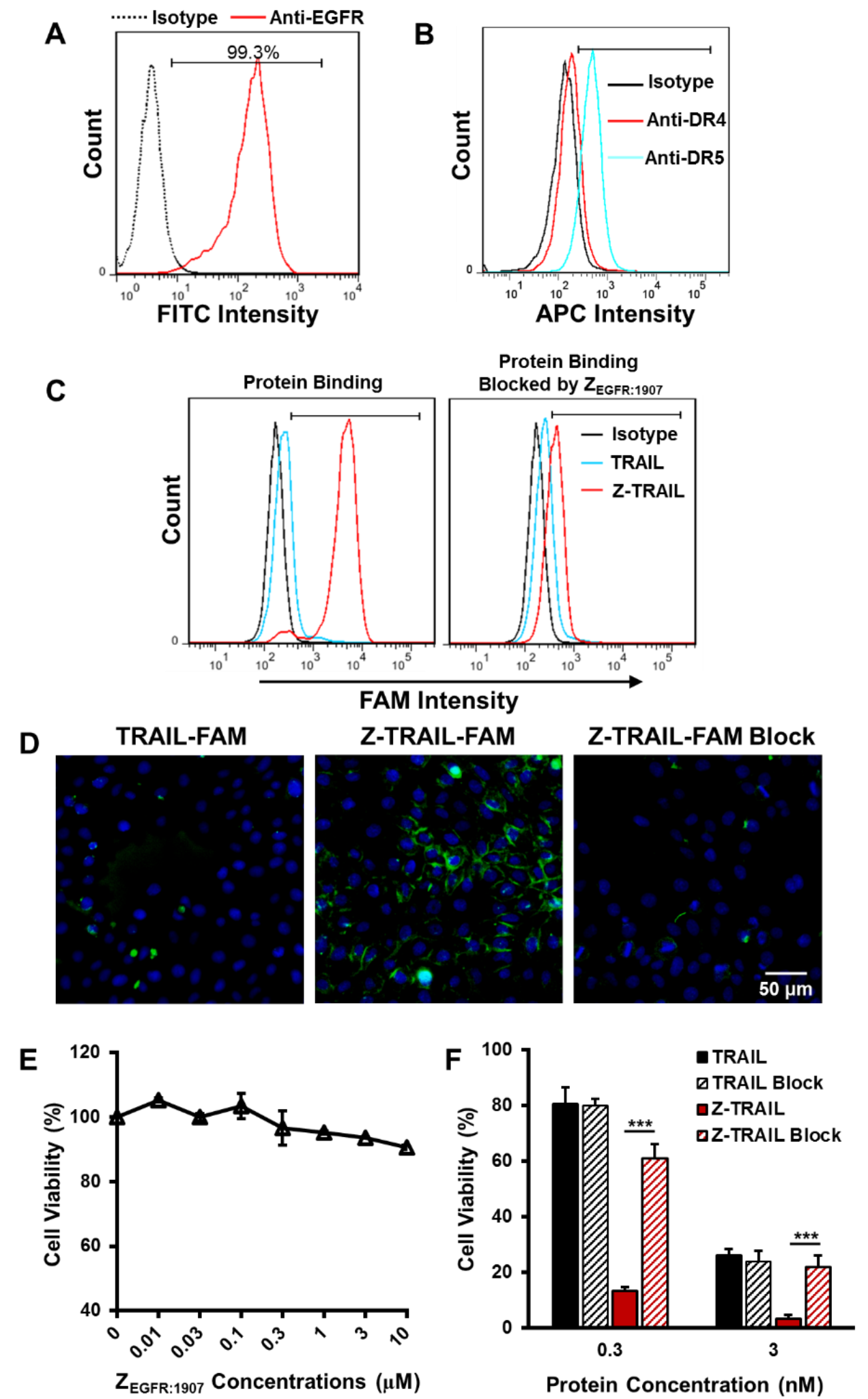 2)进一步分析Z-TRAIL对肿瘤细胞的选择性杀伤作用以及机制。相比于TRAIL,Z-TRAIL对肿瘤细胞的杀伤能力增强5~20倍;体外结合实验表明Z-TRAIL对EGFR高表达细胞株A431细胞有更强的结合能力。