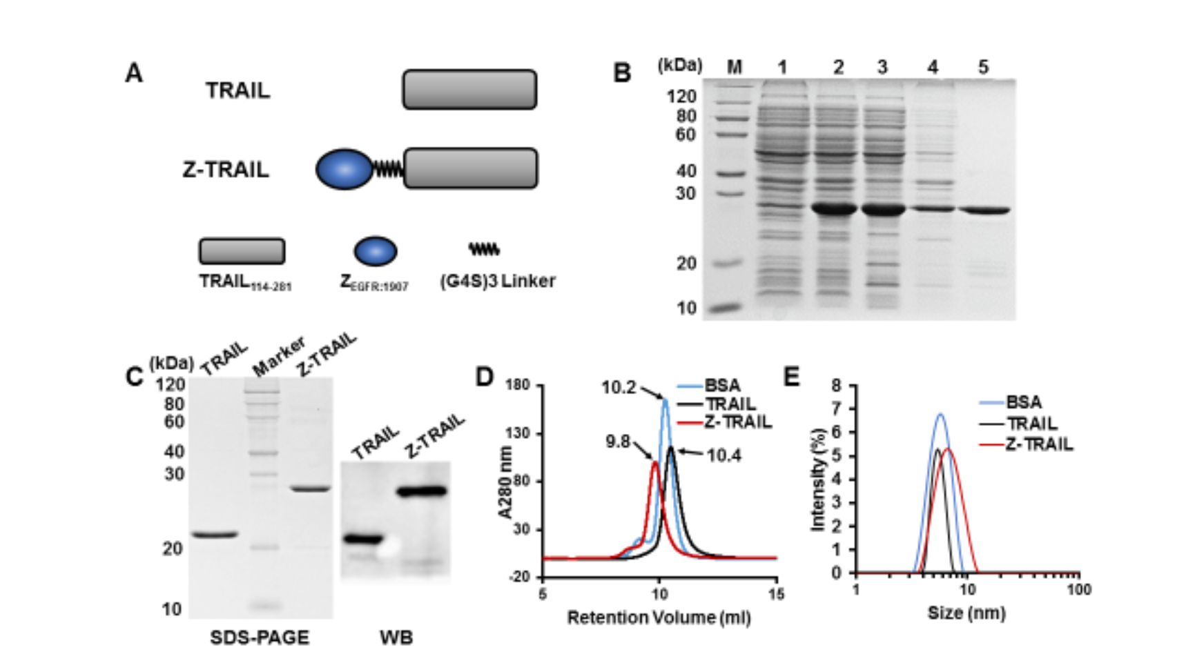 1)本研究设计将亲合体ZEGFR:1907融合在TRAIL的N末端,全基因合成该融合基因插入pQE30载体,得到Z-TRAIL表达质粒。将其导入大肠杆菌中表达纯化,得到Z-TRAIL融合蛋白。通过凝胶过滤层析及动态光散射可知,Z-TRAIL是均一的三聚体。