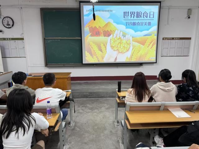 活动伊始,团队成员以全球环境面临的粮食问题与国家粮食安全战略为切入口,强调了当下粮食的短缺性与粮食安全对国家稳定发展的重要性,引导学生们珍惜粮食,感恩农民辛勤付出。随后,团队成员组织学生们观看粮食生产纪录片,纪录片通过聚焦鲜活生动的事例、普通人物的命运故事,以点带面、深入肌理,全面解读中国特色的粮食安全之路和十年来中国粮食安全所取得的巨大成就,向世界展现了粮食安全建设的中国经验、中国智慧和中国精神,让学生充分了解中国特色粮食安全之路如何越走越稳健、越走越宽广。活动结束后,学生们纷纷表示作为新时代青年学子,将高度关注粮食安全问题,积极宣传粮食安全知识,争当新时代粮食安全倡导者、贡献者、守护者。