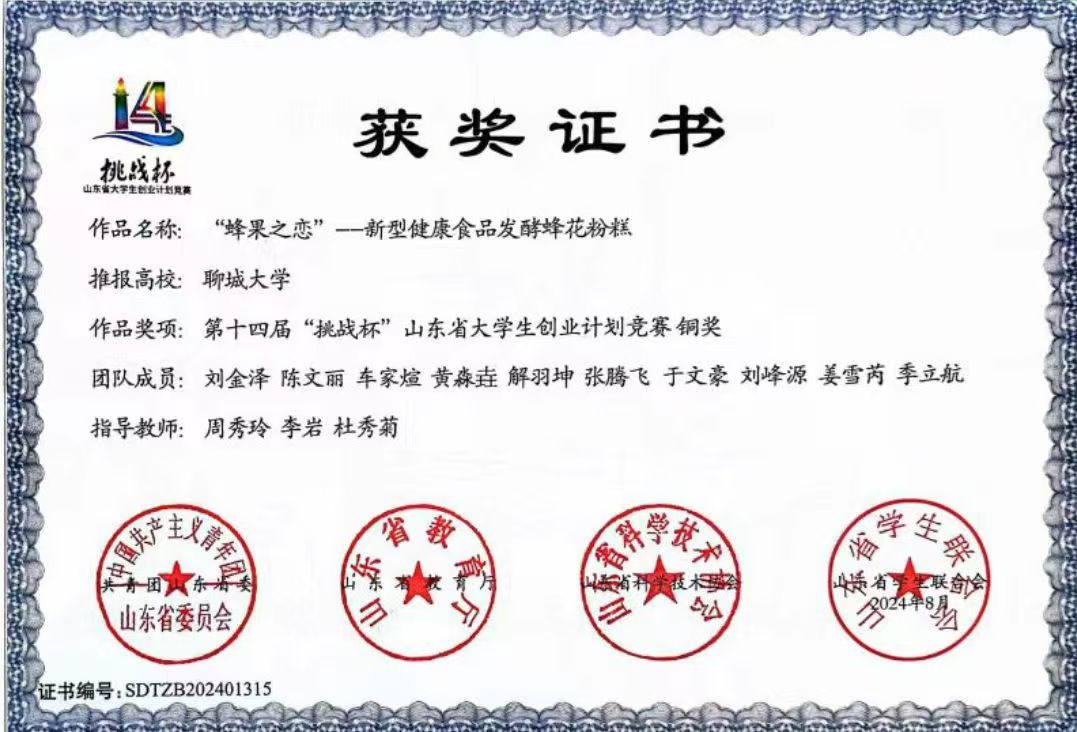 热烈祝贺365英国上市张腾飞荣获“第十四届“挑战杯”山东省大学生创业计划竞赛(2024,科学研究类)”铜奖