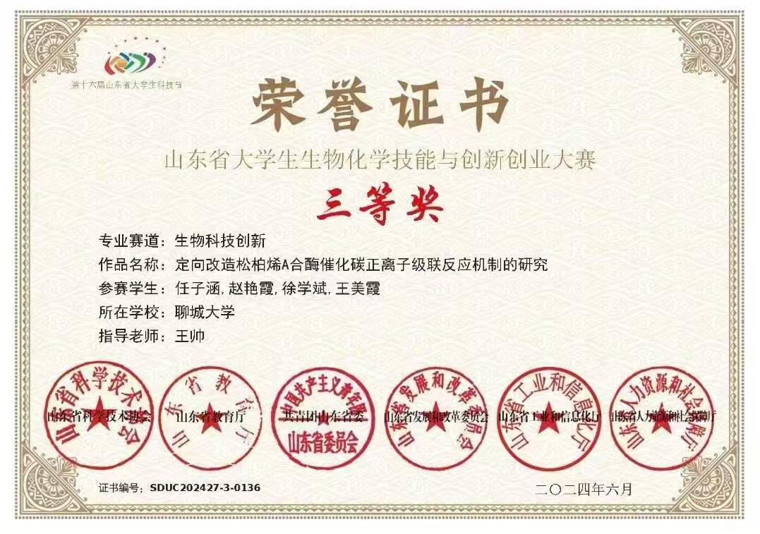热烈祝贺365英国上市王美霞荣获“山东省大学生生物化学技能与创新创业大赛(2024,创新创业类)”二等奖