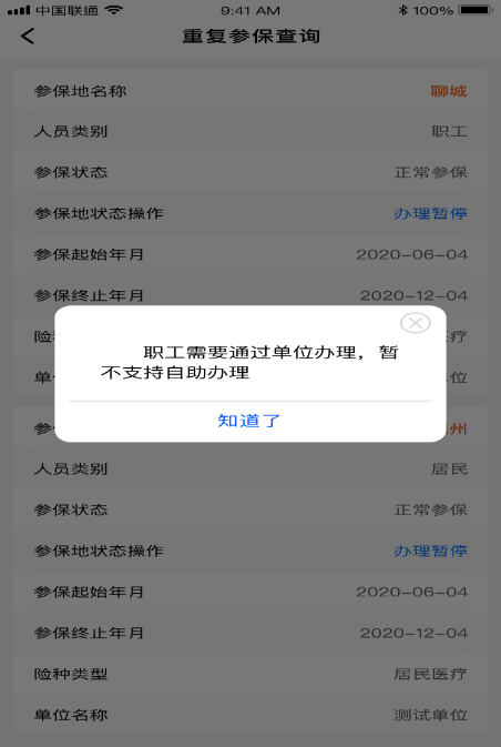 (一)如果您重复参保查询的人员类别是“职工”,职工需要单位通过网上办事大厅办理,小程序暂不支持个人自助办理。