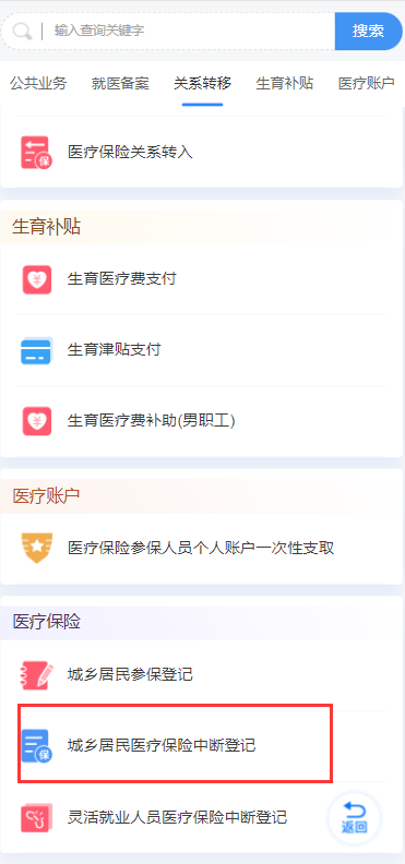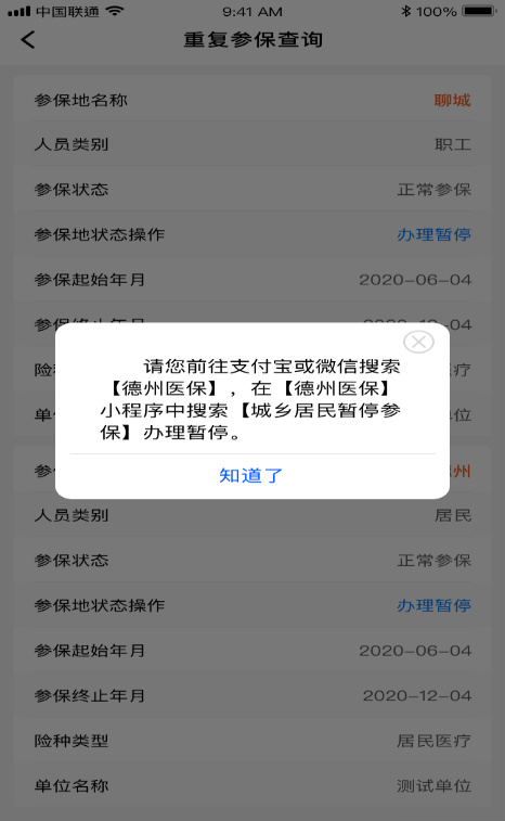 (二)如果您重复参保查询的人员类别是“居民”,参保人员可通过支付宝或微信搜索户籍地所在地市医保小程序(比如您的户籍地是聊城,微信或支付宝搜索【聊城医保】小程序),登录小程序,首页找到【我要办事】,点击【城乡居民医疗保险中断登记】,按提示要求办理即可。