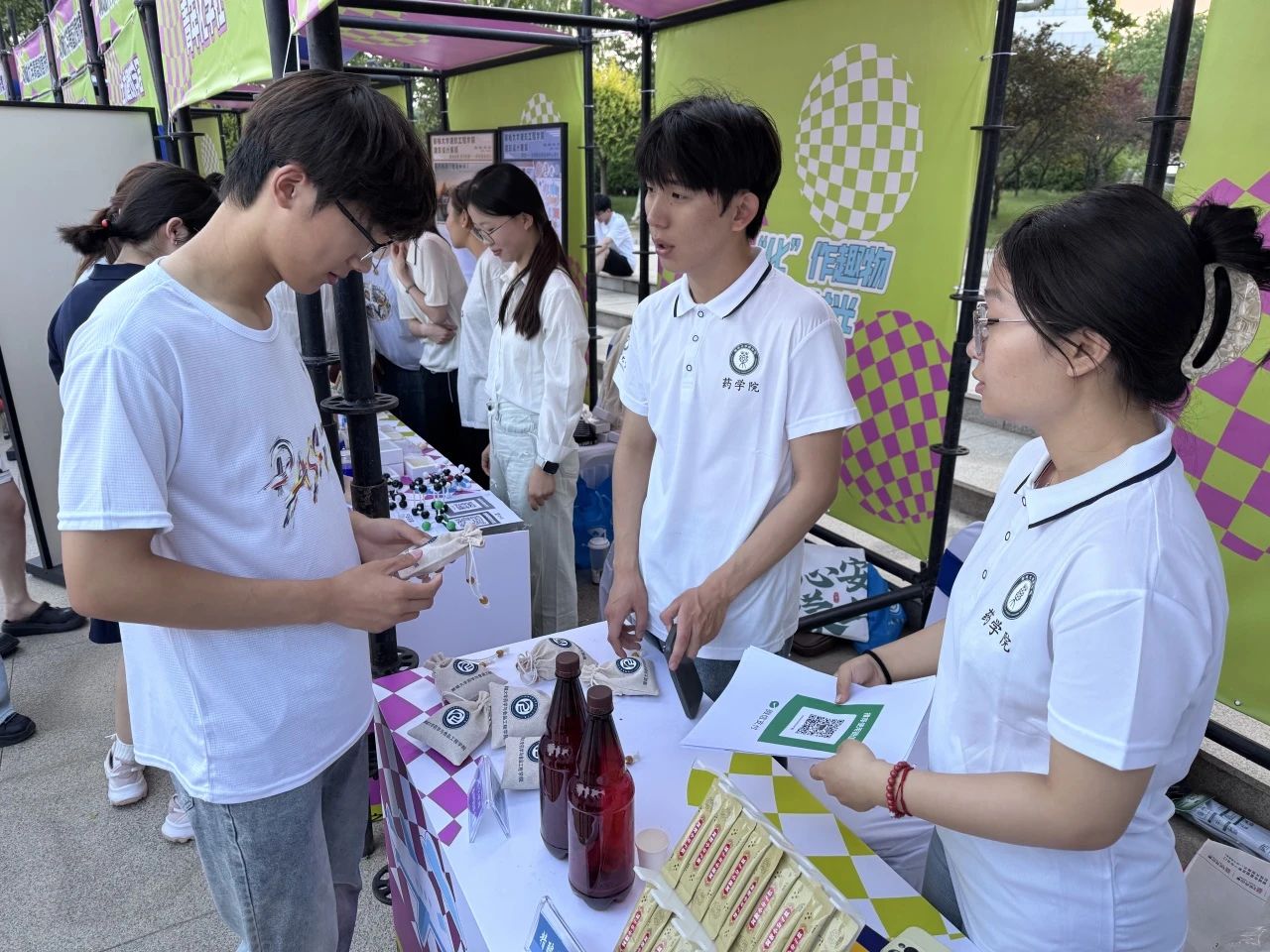 此次活动以推动区域间文旅交流合作、促进文旅资源共享与产业协同发展为目标,精准聚焦青年客群的文旅需求,搭建起极具活力的展示与互动平台,通过“浪、宅、野”三大特色场景,生动展现并推介山东文旅新产品。在这场充满青春气息与文化魅力的盛会中,我院积极参与,精心布置的摊位成为活动亮点之一,摊位上陈列着自研的学派精酿干红葡萄酒、精酿黄啤、阿胶小分子肽、花知棠护肤品、日晷香熏以及清宁枕畔安神助眠香囊。活动期间,摊位前人头攒动,现场观众纷纷被这些特色产品吸引,亲自品尝学派精酿干红葡萄酒和精酿黄啤,感受产品背后蕴含的匠心与品质。花知棠海棠精油产品和清宁枕畔安神助眠香囊也备受关注,观众亲身尝试,体验产品带来的舒适感。同时,志愿者们详细讲解产品的原料来源、制作工艺和功效,让观众深入了解到了我院在产品研发方面的创新与用心。