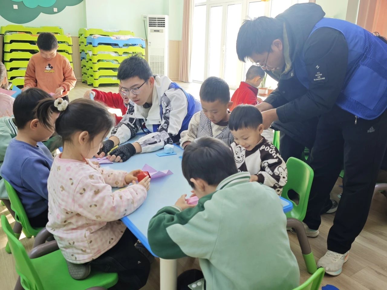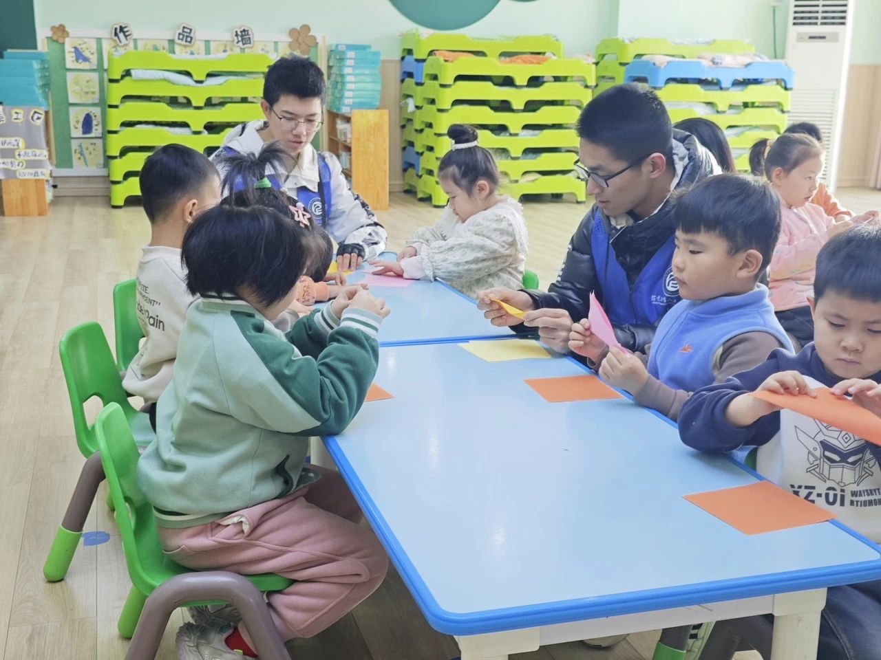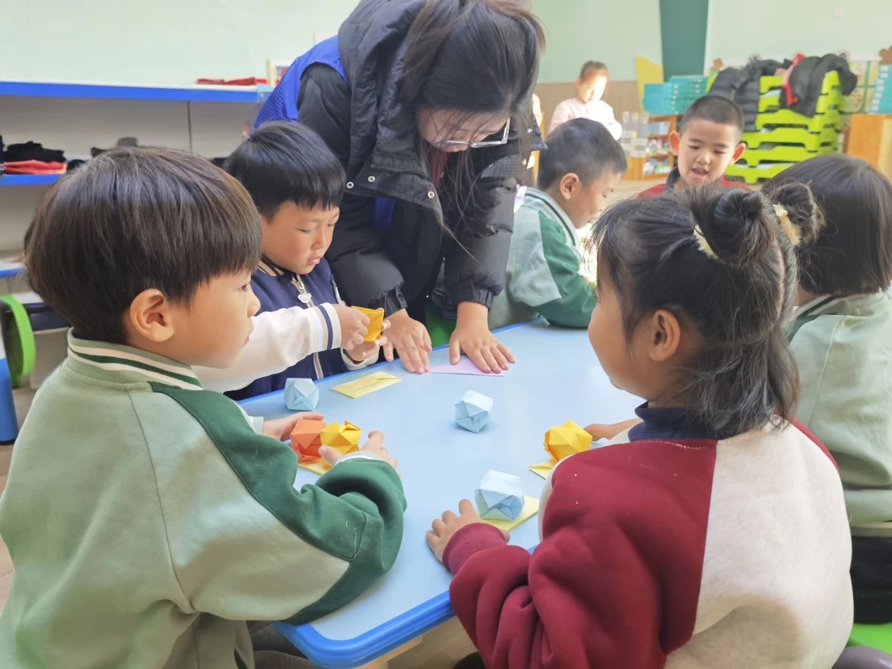 活动伊始,团队成员向小朋友展示了预先折好的花束、灯笼、鞭炮等折纸成品,激起了小朋友们对于折纸的热情。随后,团队成员将小朋友们分为若干小组,并分发彩纸,鼓励小朋友们结合新春题材发挥创意,动手折叠属于自己的作品。在团队成员的耐心指导下,孩子们纷纷拿起彩纸,认真投入到折纸创作中。他们时而低头专注折叠,时而相交流心得,整个活动现场充满了浓厚的创作氛围与欢声笑语。活动伊始,团队成员向小朋友展示了预先折好的花束、灯笼、鞭炮等折纸成品,激起了小朋友们对于折纸的热情。随后,团队成员将小朋友们分为若干小组,并分发彩纸,鼓励小朋友们结合新春题材发挥创意,动手折叠属于自己的作品。在团队成员的耐心指导下,孩子们纷纷拿起彩纸,认真投入到折纸创作中。他们时而低头专注折叠,时而相交流心得,整个活动现场充满了浓厚的创作氛围与欢声笑语。