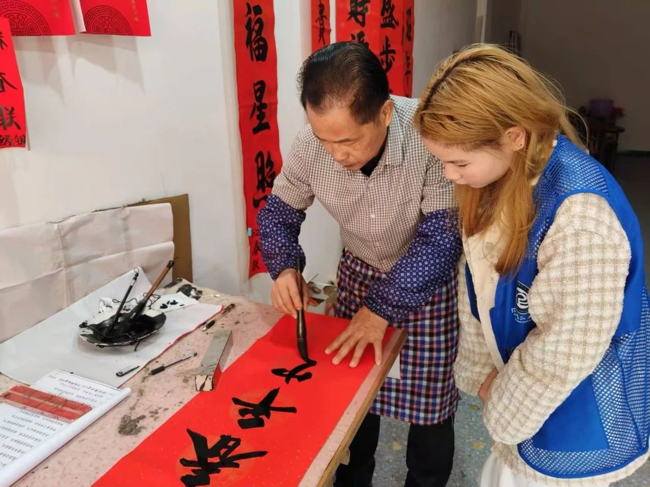 活动伊始,团队成员从毛笔的历史、文化内涵以及书法艺术三方面向参与人员讲解了毛笔的相关知识,激发了参与人员对毛笔文化的兴趣。随后,团队成员通过展示各种毛笔以及书法作品,让参与人员近距离感受毛笔文化的魅力。互动体验环节中,参与人员亲手尝试书写毛笔字,他们在喜庆的红纸上写下祝福,共同感受书法的乐趣与新年的喜悦。活动结束后,参与人员纷纷表示,对毛笔书法有了全新认知,不仅在亲手书写中体会到了毛笔书法带来的宁静与专注,更感受到了传统文化的深厚底蕴。