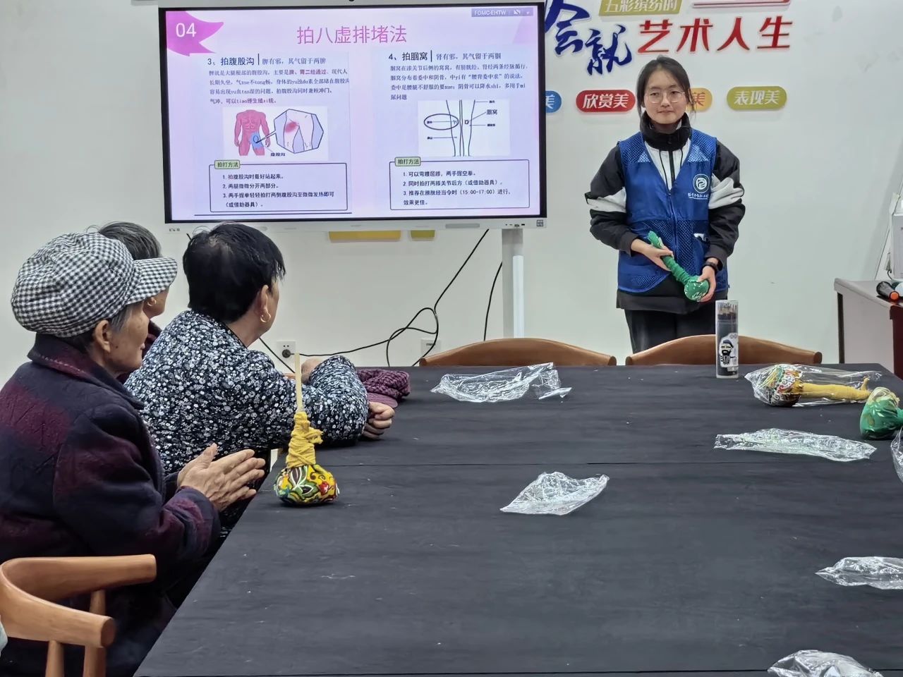 活动伊始,团队成员通过精心准备的PPT向社区女性科普相关健康知识,包括生理健康和心理健康的疾病预防、良好日常习惯等内容,同时,团队成员向社区女性分享了一些简单易行的自我检查方法,帮助社区女性及时发现身体异常,及早就医。随后,团队成员向社区女性介绍了艾草锤的有关知识,耐心地为她们讲解如何使用艾草锤拍八虚排毒,并注重社区女性的反馈,对社区女性提出的问题做出细致解答,社区女性全神贯注,积极参与,氛围和谐融洽。活动结束后,社区女士纷纷表示获益匪浅,不仅了解了女性保健的必备知识,更加明确了养成健康科学的生活习惯的重要性。