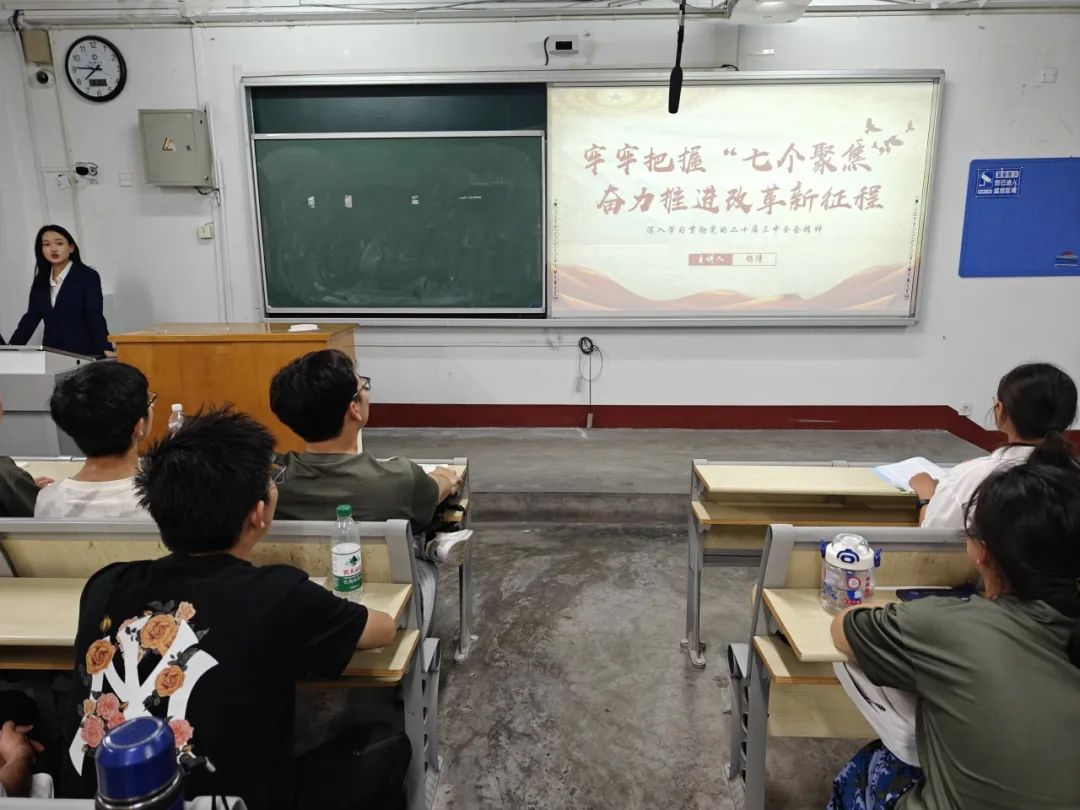 为深入学习贯彻党的二十届三中全会精神,帮助广大青年准确把握全面深化改革的目标任务和重大意义,9月18日,我院于英国365集团公司东校区2#202、309举办“牢牢把握‘七个聚焦’,奋力推进改革新征程”主题教育宣讲会,邀请政治与公共管理学院23级研究生杨倩担任主讲人。