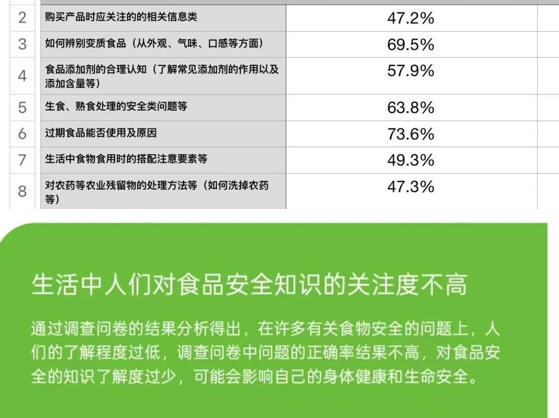 食品安全调研问卷主要围绕民众对食品安全知识和常识的掌握情况展开,内容涵盖食品标识认知、农药残留去除方法、网购食品注意事项等方面,以判断正误和选择题的形式出题,考查民众在日常生活中常见食品安全场景下的认知与应对能力。调查数据显示,民众对食品安全知识的关注度普遍较低,另外,在涉及食品保质期识别、添加剂安全范围、生熟食品储存差异等基础问题上,整体正确率不高。学生纷纷表示,应当加深民众对于食品安全知识的认知,呼吁大家认识和了解食品安全,提升全民食品安全意识,保障公众的饮食安全和身体健康。