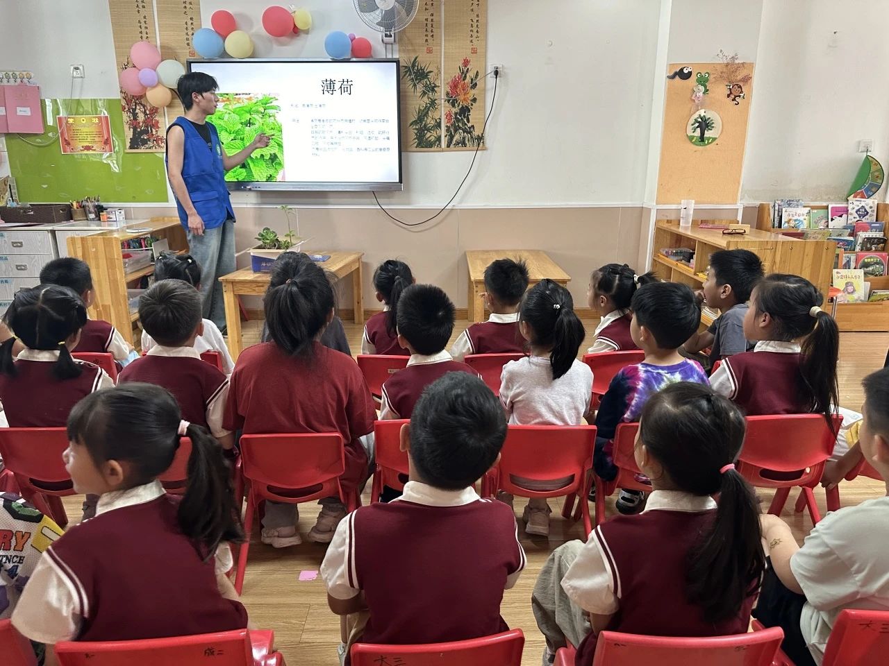 活动中,团队成员为小朋友展开了一幅药用植物的“图谱”,借助童趣化的语言和高清图片,逐一介绍了薄荷、金线莲、金银花、八宝、菩提树等常见药用植物,团队成员将植物的外形特征、生长习性与简单药用价值融入小故事,小朋友听得兴致勃勃,纷纷举手分享自己的发现。讲解结束后,团队成员端出精心培育的薄荷、金线莲、菩提树等实体绿植,邀请小朋友近距离观察。小朋友通过触摸、嗅闻及观察,将图谱里的知识与实物对应起来,增强了对中医草药的认识。团队成员还介绍了种植药用植物的注意事项,小朋友根据所学知识对种植药用绿植有了初步了解,并且领取了药用绿植带回家培养。