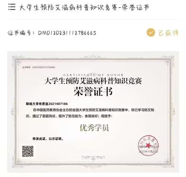 热烈祝贺药学院佟思宜荣获“大学生预防艾滋病科普知识竞赛”荣誉证书