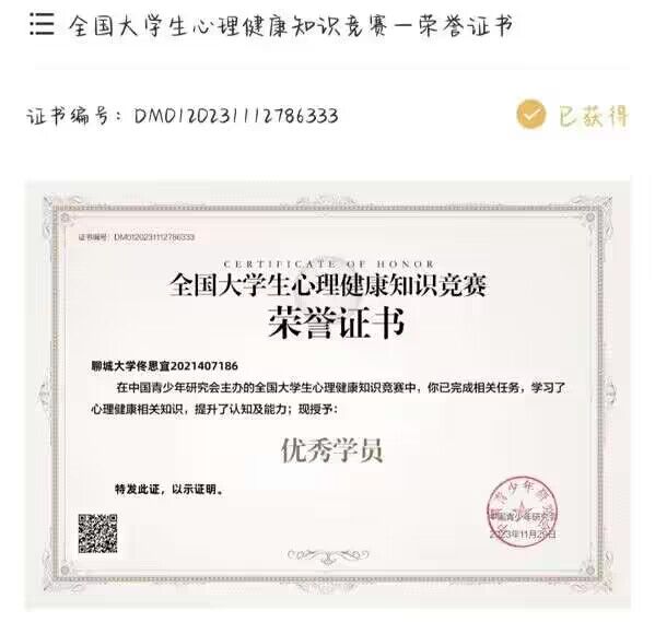 热烈祝贺药学院佟思宜荣获“全国大学生心理健康知识竞赛”荣誉证书
