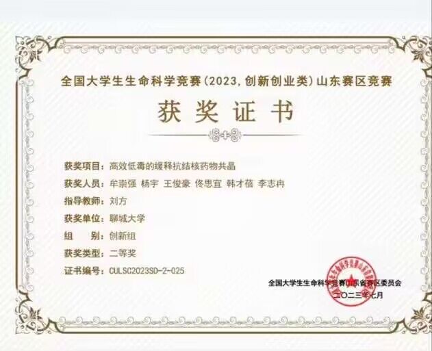 热烈祝贺药学院佟思宜荣获“全国大学生生命科学竞赛山东省区竞赛”二等奖