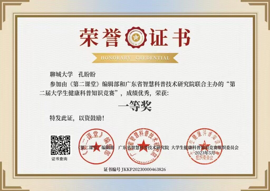 热烈祝贺药学院孔盼盼荣获“第二届大学生健康科普知识竞赛”一等奖