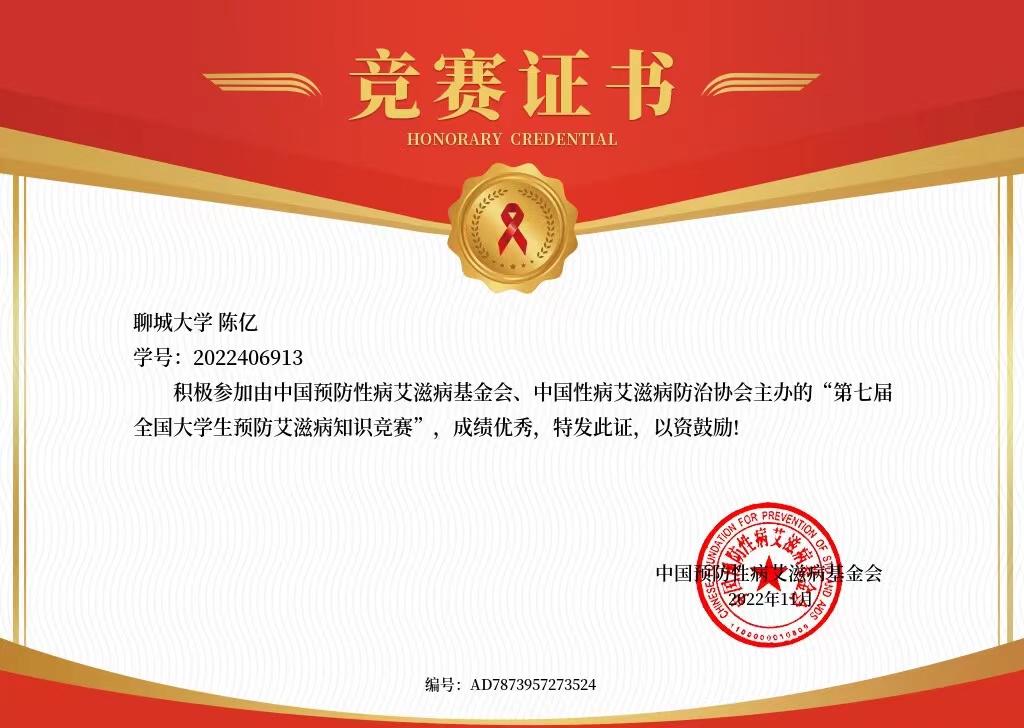 热烈祝贺药学院陈亿荣获“第七届全国大学生预防艾滋病知识竞赛”优秀奖