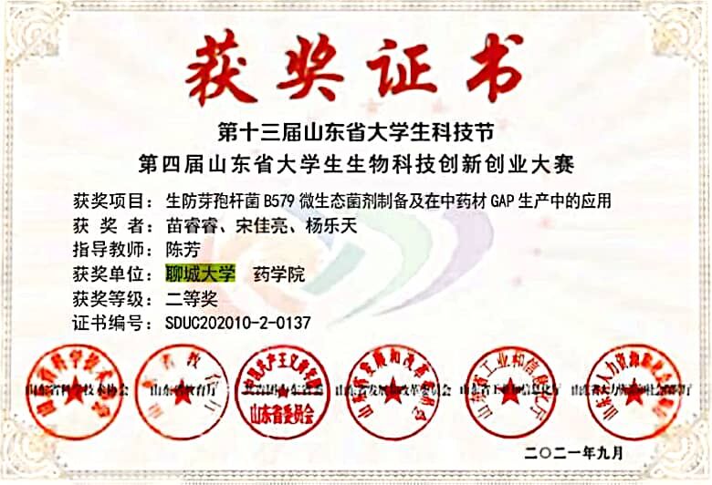 热烈祝贺药学院杨乐天荣获第十三届山东省大学生科技节第四届山东省大学生生物科技创新创业大赛二等奖