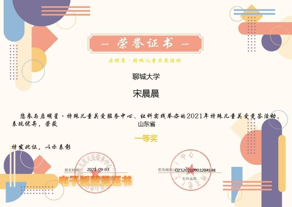 热烈祝贺药学院宋晨晨荣获2021年启明星特殊儿童线上关爱活动一等奖
