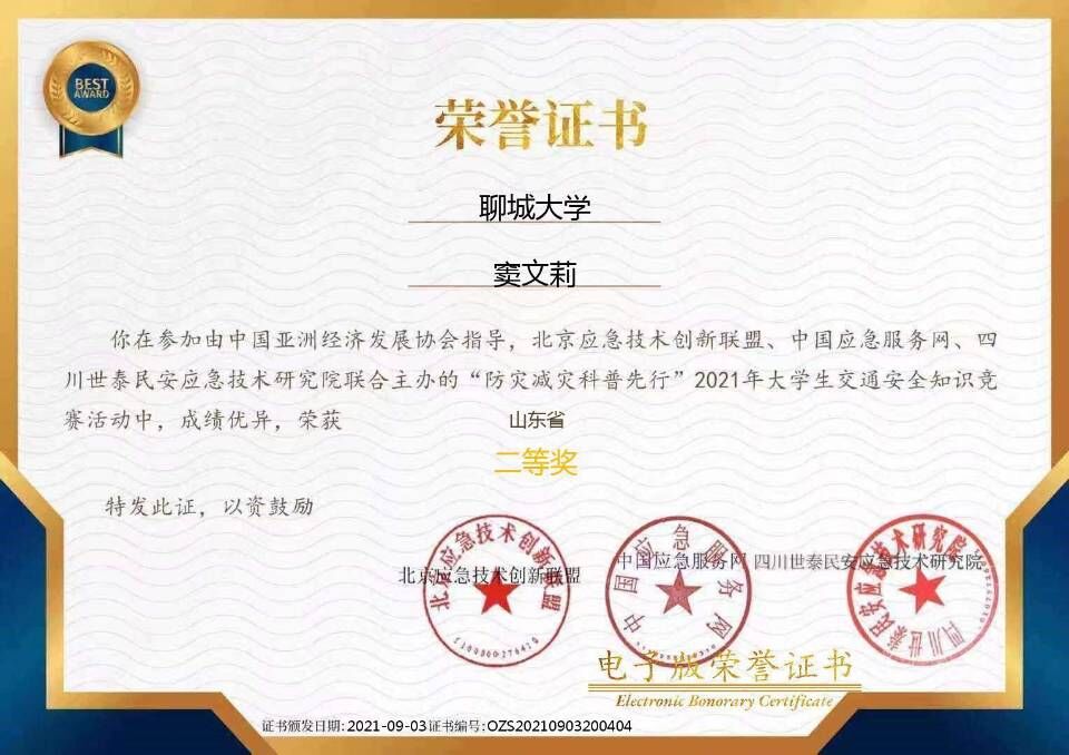热烈祝贺药学院窦文莉荣获2021年“防灾减灾科普先行”大学生交通安全竞赛二等奖
