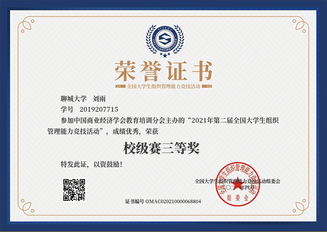 热烈祝贺药学院刘雨荣获“2021年第二届全国大学生组织管理能力竞技活动”校级赛三等奖