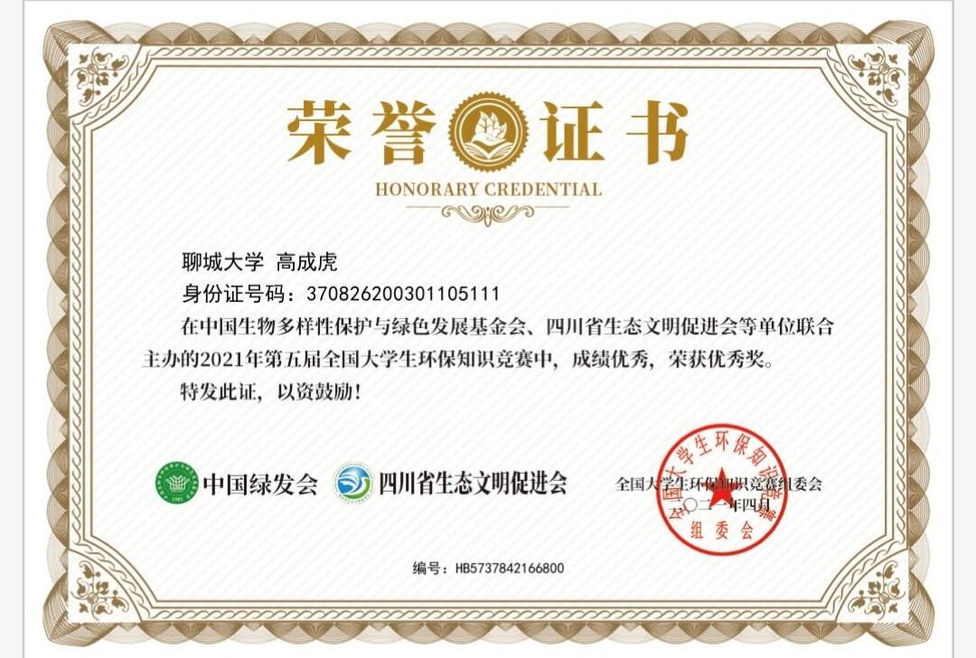 热烈祝贺药学院高成虎荣获环保知识竞赛优秀奖
