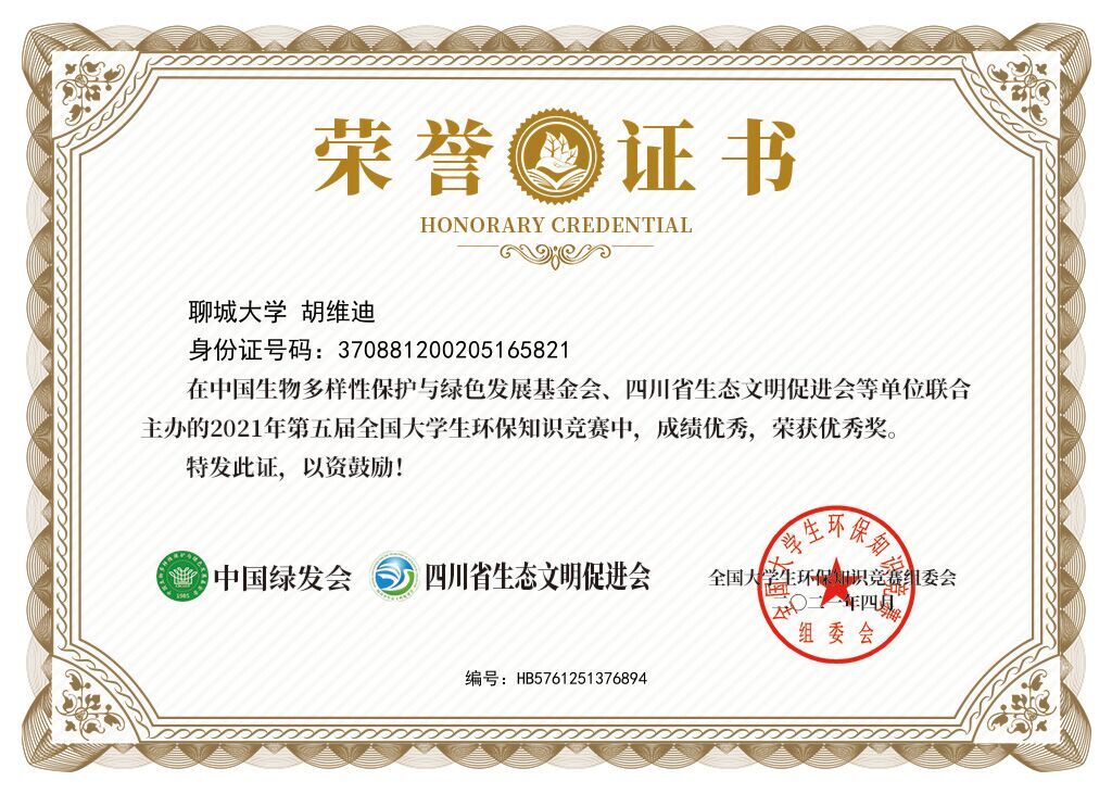 热烈祝贺药学院胡维迪荣获第五届大学生环保知识竞赛优秀奖