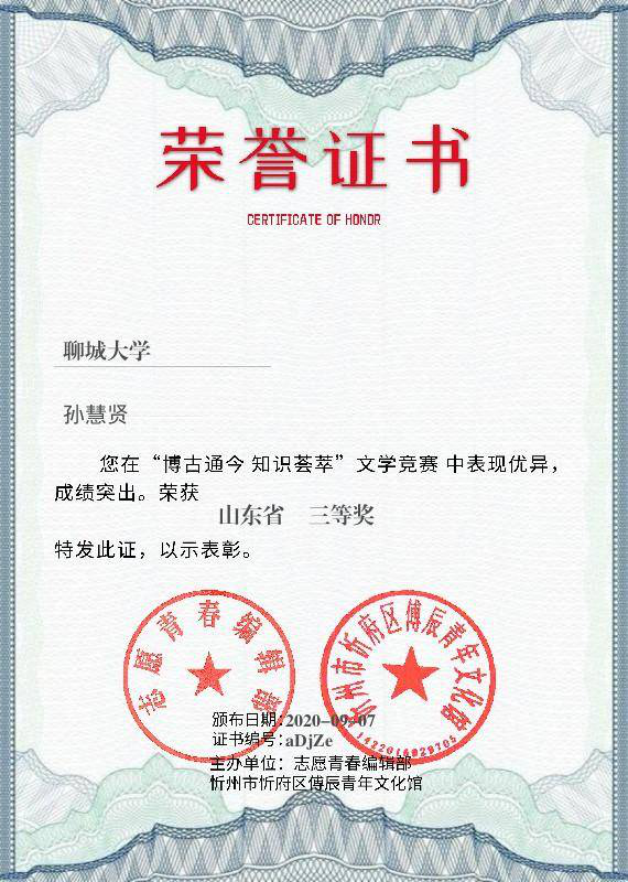 我院孙慧贤获“博古通今 知识荟萃”文学竞赛三等奖