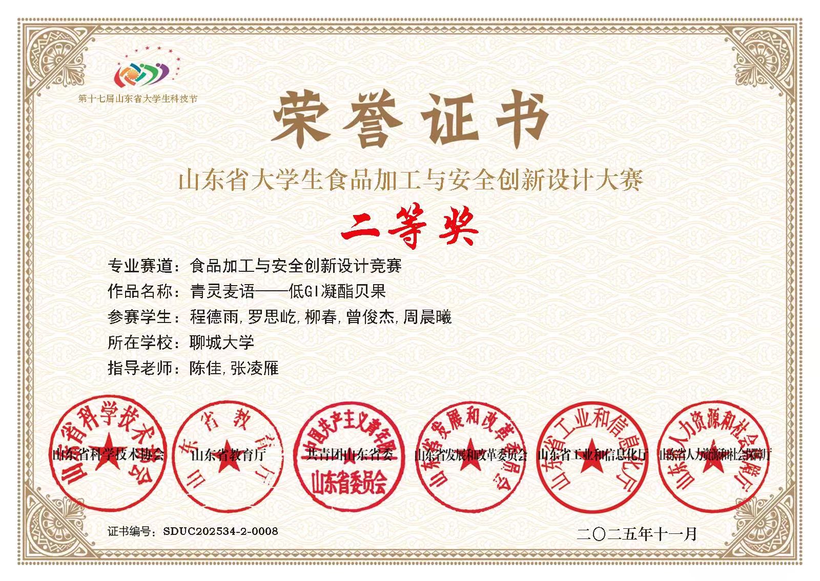 热烈祝贺365英国上市柳春荣获山东省大学生食品加工与安全创新设计大赛二等奖