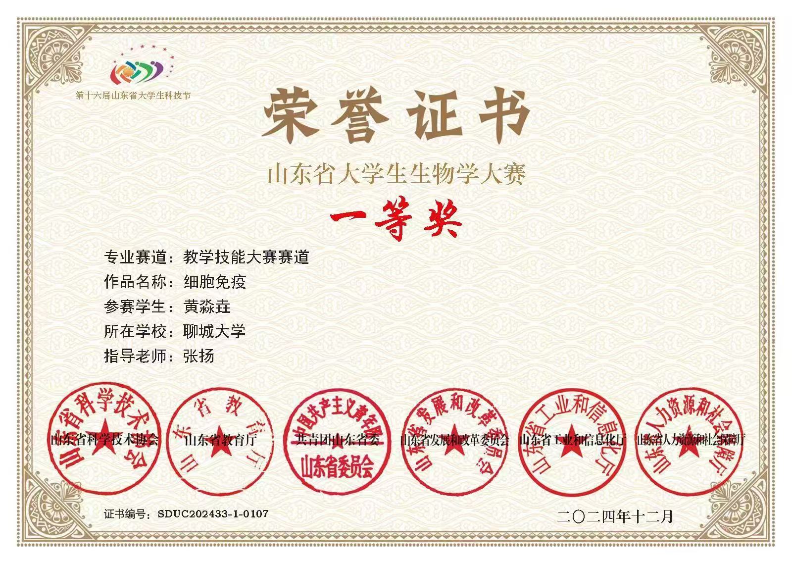 热烈祝贺365英国上市黄淼垚荣获全国大学生生命科学竞赛(2023,创新创业类)山东赛区竞赛一等奖
