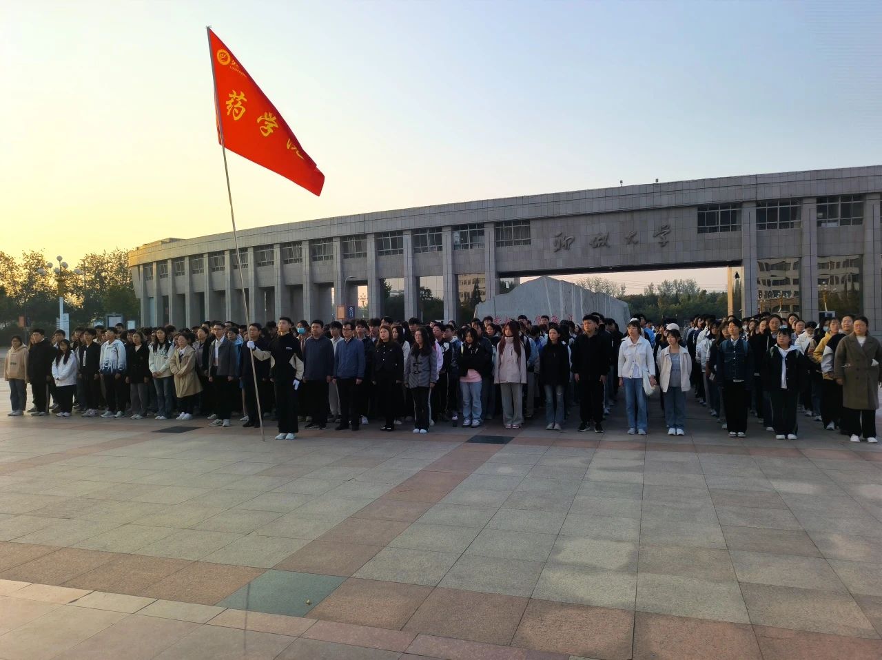 上午七时,国旗护卫队队员迈着铿锵有力的步伐,护送国旗行至升旗台。伴随着国歌《义勇军进行曲》的雄壮旋律,鲜艳的五星红旗冉冉升起,迎着全体师生的目光,在秋天的晨曦中迎风飘扬。马克思主义学院曹正春为我院学生讲述以《缅怀先烈,慎终追远》为题的主题微团课。她强调学生需传承红色血脉,弘扬爱国主义精神,并从“红色血脉承载生命密码“、“红色血脉指引前进方向”、“红色血脉永葆前进动力”三个方面强调学生应在红色精神的引领下,成为中国特色社会主义合格的建设者。我院学生代表进行原创主题诗词朗诵《青春筑梦,强国有我》,学生们以恢弘的气势、真切的情义,高远的立意及动人的诗意,沿着历史长河将中国故事向我们娓娓道来,他们用热血激昂的朗诵,诉说着革命先烈的丰功伟绩,赓续代代相传的红色基因。