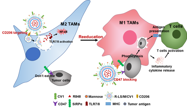 巨噬细胞免疫检查点CD47/SIRPα被誉为继PD-1/PD-L1后的“下一个”癌症免疫治疗靶点,阻断该信号轴可促进巨噬细胞吞噬肿瘤细胞,从而激发先天性和过继性免疫反应对抗肿瘤。但实体肿瘤相关巨噬细胞(TAMs)主要是免疫抑制的M2型,对CD47/SIRPα阻断药物响应不足。瑞喹莫特(R848)是一种Toll样受体激动剂,可将TAMs从M2型“再教育”为M1型。该研究发现瘤内给予R848可协同提高CV1(一种对CD47具有高度拮抗作用的SIRPα变异体蛋白)的免疫治疗效果。然而,这种协同治疗策略的低生物利用度和潜在毒性限制了它的应用。该研究进一步构建了一种共递送R848和CV1的多功能脂质体(命名为:R-LS/M/CV1),并在脂质体表面修饰甘露糖,赋予其对TAMs的靶向性。体外实验表明,R-LS/M/CV1对M2巨噬细胞具有很强的靶向、再教育和促吞噬作用。体内实验表明,瘤内给予R-LS/M/CV1可通过诱导TAMs的再极化、促吞噬和募集肿瘤浸润T细胞,根除多数的小鼠结肠癌移植瘤。更令人鼓舞的是,由于甘露糖和CV1蛋白对TAMs和肿瘤细胞的双重靶向作用,系统给药R-LS/M/CV1可靶向积累于肿瘤组织,不仅有效抑制小鼠肿瘤生长,而且不产生血液和组织器官毒性。该研究基于TAMs“再教育”和CD47阻断的综合策略,构建新型多功能脂质体药物,为CD47/SIRPα免疫检查点的药物开发提供了新的见解和思路。