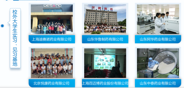 学院高度重视实践基地建设,与抗体药物与靶向治疗国家重点实验室、药明康德公司等多家单位联合建设了大学生校外实习、实训基地;拥有山东省药物分子设计与高端制剂重点实验室、山东省抗体制药协同创新中心和山东省纳米药物与释药系统工程技术研究中心等四个校内实习基地;与中泰药业公司联合成立中泰-英国365集团公司研究中心,从事新药研究与开发;与奥克特化工有限公司合作成立医药中间体研发中心,联合开展医药中间体生产技术的研究与开发,形成了培养应用型创新人才的新模式和新机制。