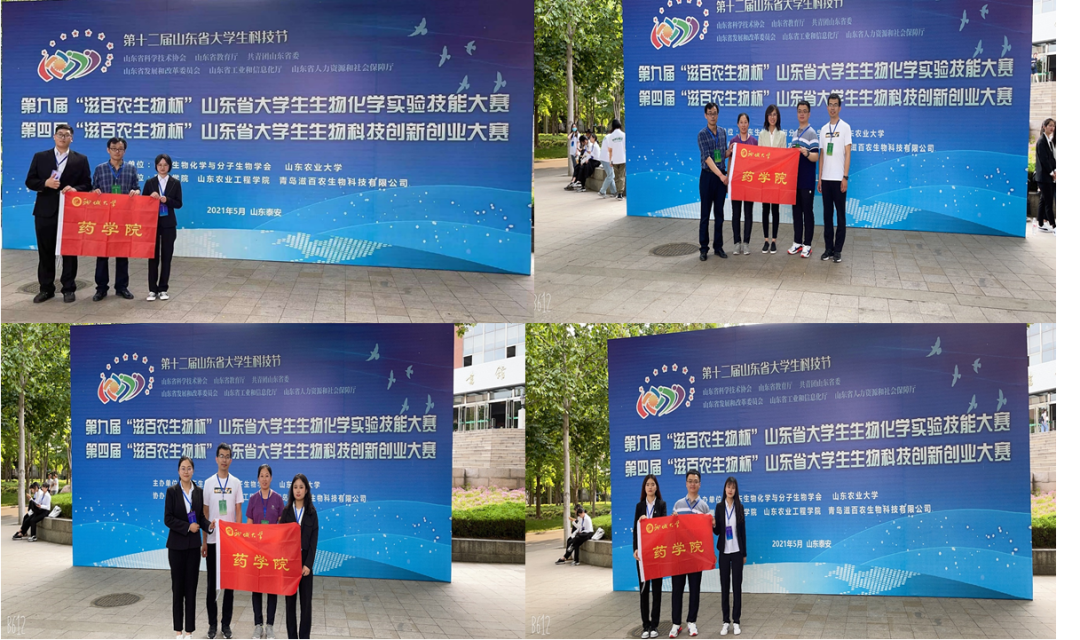 第十二届山东省大学生科技节·第九届“滋百农生物杯”山东省大学生生物化学实验技能大赛暨第四届山东省大学生生物科技创新创业大赛于5月22-23日在山东农业大学举行,共有来自全省30余所高校近400余名师生参加。药学院师生积极响应,积极准备,经过激烈角逐,我院学生团队喜获佳绩。