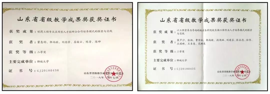 专业教师参加省部级教学竞赛8项,其中获国家级二等奖1项,三等奖2项,优秀奖1项。2018年,学院教研项目“以工程素养为导向的地方本科院校生物工程专业人才培养模式的探索与实践”、“制药工程专业应用型人才校研企合作培养模式的探索与实践”均获山东省本科教学成果二等奖。