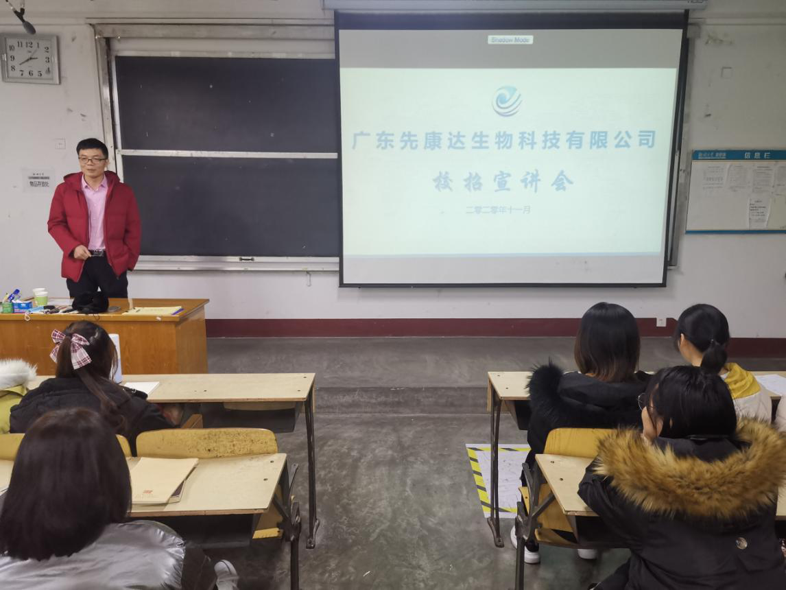 为加深学生对行业认知,指导学生实习就业,增强学生与企业之间的了解与交流,使药学院学生更加明确自己毕业后的就业目标与方向,11月25日,广东先康达生物科技技术有限公司于2#205举办校招宣讲会,公司董事长谢海涛担任主讲人,药学院部分同学积极参与其中。