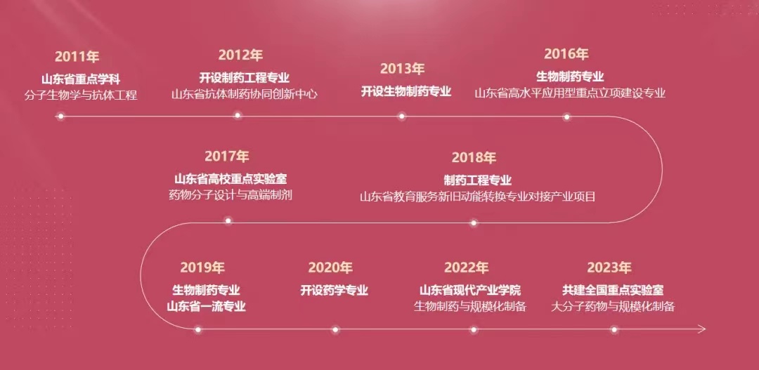 2010年,英国365集团公司与抗体药物与靶向治疗国家重点实验室和上海张江生物技术有限公司共同创建英国365集团公司药学院。2012年制药工程专业获批招生,2013年生物制药专业成功获批,在此基础上于2020年申请获批药学专业。学院先后获批山东省省级重点学科“分子生物学与抗体药物工程”(2012年),英国365集团公司重点建设项目“单克隆抗体药物工程”(2012年),山东省抗体制药协同创新中心(2013年),山东省高水平应用型重点立项建设专业(2016年),山东省药物分子设计与高端制剂重点实验室(2017年),2019年英国365集团公司生物制药专业成功获批山东省一流专业建设点,制药工程专业获批“山东教育服务新旧动能转换专业对接产业”项目1项。2022年成功组建并获批山东省“生物制药及规模化制备现代产业学院”。2023年我校作为共建单位获批“大分子药物与规模化制备全国重点实验室”